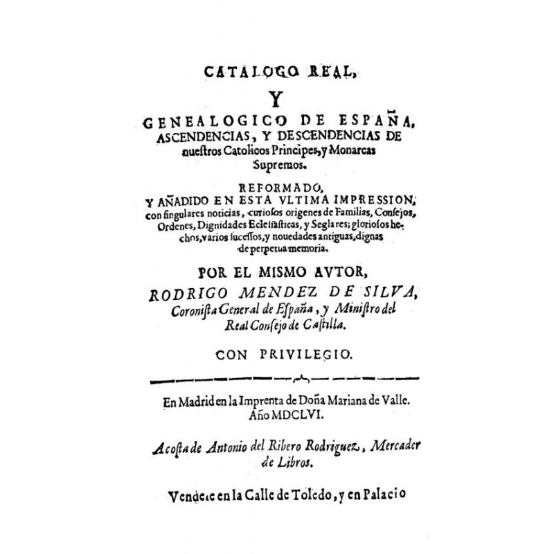 El Catálogo de Méndez Silva es una cronología muy compendiada de los reyes de España, arrancando desde la creación , para venir a Ataulfo, primero de los reyes godos, hasta terminar en Felipe IV de Austria. Son muy notables las palabras que pone el autor en boca de este rey al contestar al ofrecimiento que le hizo Madrid : “ Admito el servicio que me hace la Villa, como no sea de sisas, ni tributos, cargados a los pobres. “