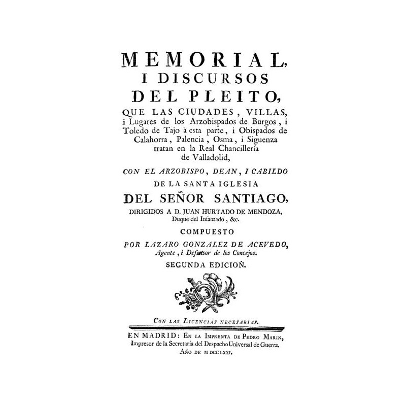 TITULO COMPLETO : Memorial i discursos del pleito que las ciudades villas y lugares de los Arzobispados de Burgos y Toledo de Tajo a esta parte i Obispados de Calahorra, Palencia, Osma y Sigenza tratan en la Real Chancilleria de Valladolid