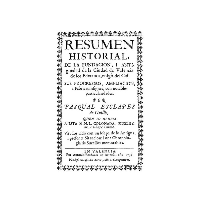 Resumen historial de la fundación y antigüedad de la ciudad de Valencia de los Edetanos, vulgo del Cid sus progresos, y fabricas insignes con notables particularidades