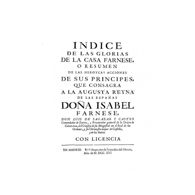 TITULO COMPLETO : Índice de las glorias de la Casa Farnese o resumen de las heroycas acciones de sus pr¡ncipes
