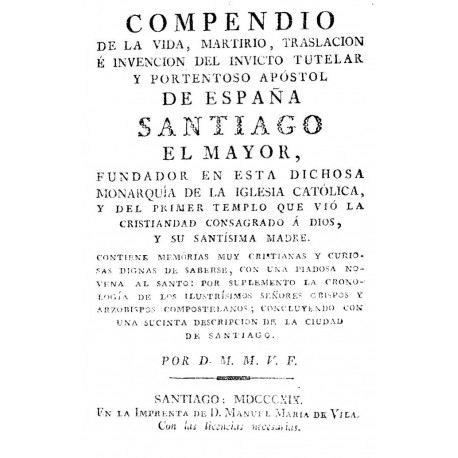 TITULO COMPLETO : Compendio de la vida, martirio, traslación e invención del invicto tutelar y portentoso apóstol de España Santiago el Mayor, fundador en esta dichosa monarquía de la Iglesia católica y del primer templo que vió la cristiandad
