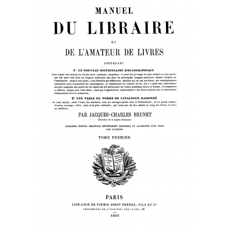 La obra de Mr Brunet es tan indispensable al bibliógrafo como el martillo al carpintero ,el yunque al herrero, y la azada al labrador : no es por tanto extraño que sea la primera que adquiere quien trata de formar una biblioteca en cualquiera de los ramos del saber humano, y la que continuamente consulte mientras conserve alguna afición a los libros . – Sorprende y maravilla como un hombre solo, sin más auxilios que su estudio, laboriosidad y manía, ha podido llegar a coordinar un repertorio tan precioso s la prueba más patente de los prodigios a que alcanza una fuerza de voluntad sostenida por más de sesenta años .– Mr Brunet ha tenido la buena idea de incluir en su manual solamente las obras clásicas y raras en casi todas las lenguas antiguas y modernas , y por eso son muy necios los que sin atender a estas circunstancias califican de singulares o notables todas aquellas no citadas en él, cuando la mayor parte de las veces esta falta solo indica ser el libro tan común y su valor tan ínfimo, que no ha merecido ocupar un lugar al lado de las joyas u obras útiles é interesantes descritas en el índice. También me dan lástima los que toman por tipo en sus adquisiciones o ventas los precios designados en el catálogo de Brunet, cuando este los saca de los de algunas almonedas , sin tomar en cuenta lo mucho que influye en estos casos el amor propio picado de dos o tres contrincantes adinerados; la belleza o encuadernación del libro; el haber pertenecido a algún sujeto distinguido , el gusto o la moda dominante en aquella época ; la falta de conocimientos de los presentes; algún defecto encontrado en el volumen en el acto de enajenarse , sin estar anotado en el Catálogo , y en varias ocasiones hasta las circunstancias políticas . Solo así puede explicarse la disparidad de valores que se dan a muchísimas obras .