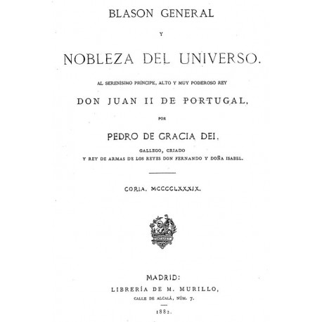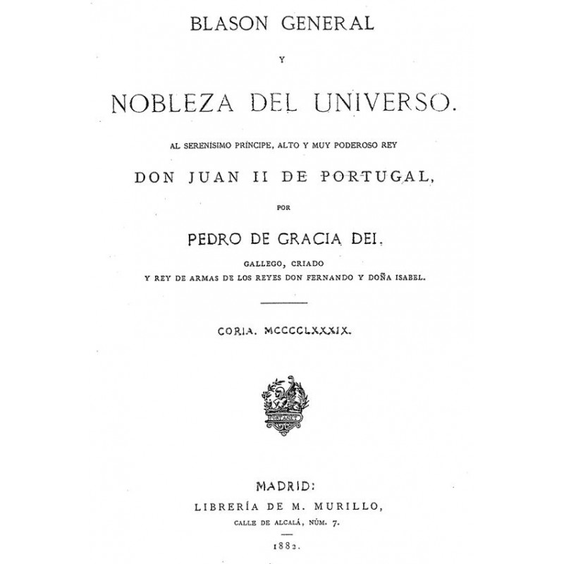 Libro raro y buscado. De la primera impresión de esta obra, en 1489 no se conocen más de dos ejemplares y nunca se publicó hasta 1882 en edición facsimil con grabados xilográficos en edición numerada hecha por Pascual de Gayangos y con un estudio preliminar del mismo. Su autor el gallego Pedro De Gratia Dei, demuestra , en estos tratados de armería, poseer vastos conocimientos bíblicos y de la kabbala hebrea así como de la ciencia astrológica que aplica el arte heráldico del blasón. Salvá señala que : “… Muestra del estilo de Gratia Dei en su dedicatoria: Noto en diversas partes ignotas invento del norte segundo que antártico polo se llama dotado de las áureas crines que Apolo radiante en las sus influye...a vos solo temen los de Anibal naturales que con temor vos esperan y de la espada alfonsí deseada osa desea porque goceis la impresa en vuestros cuños y seais verdadero triunfante cesar novel domador de los indómitos y clemente a los domados, etc..etc.. Palau señala que la foliación es incorrecta y la parte tipográfica deja que desear, pero es libro interesante, tanto por su contenido como por lo que representa en al historia de la Imprenta en España.