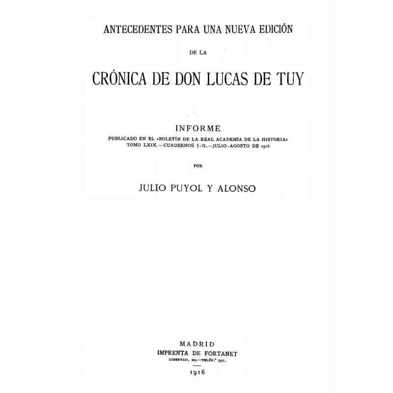 Reproduce la Edición de Madrid de Imprenta de Fortanet de 1916 ( Antecedentes ) y la de Madrid de 1926 de la Imprenta de revista de Archivos Bibliotecas y Museos( Crónica )
