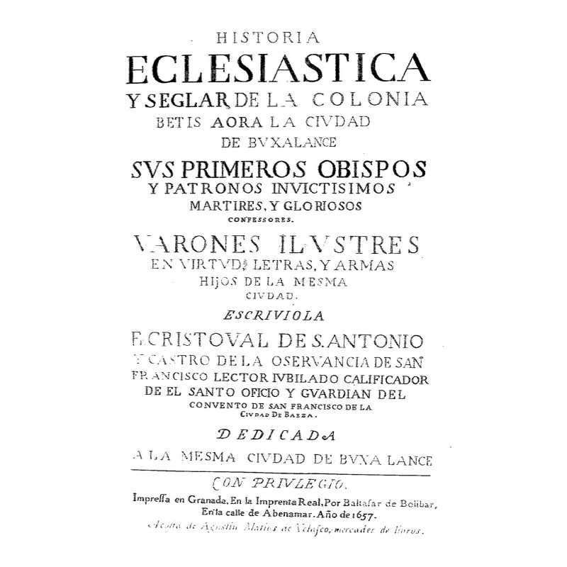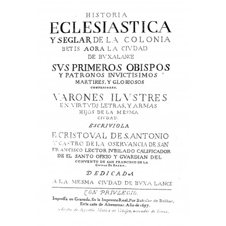 TITULO COMPLETO : Historia eclesiástica y seglar de la colonia de Betis aora la ciudad de Buxalance sus primeros obispos y patronos invictísimos mártires gloriosos y varones ilustres